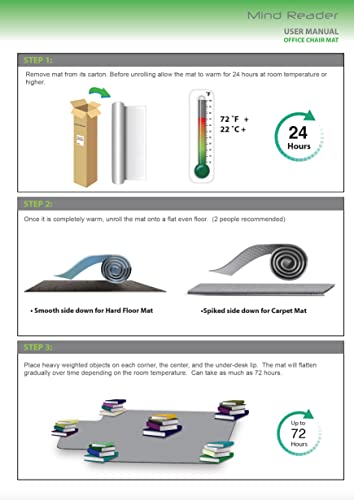 - THE MAT COMES ROLLED. FOR BEST RESULTS USE A BLOW DRYER TO FLATTEN OUT. PLEASE REFER TO THE USER MANUAL FOR FURTHER INSTRUCTIONS. THE WARMER THE CLIMATE THE QUICKER THE CHAIR MAT WILL LAYFLAT.