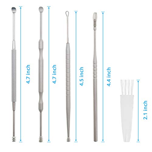 Details: MJIYA 5 Pcs Ear Pick Earwax Removal Kit, MJIYA Ear Cleansing Tool Set, Ear Curette Ear Wax Remover Tool with a Small Cleaning Brush and Storage Box (Silver-5Pcs)