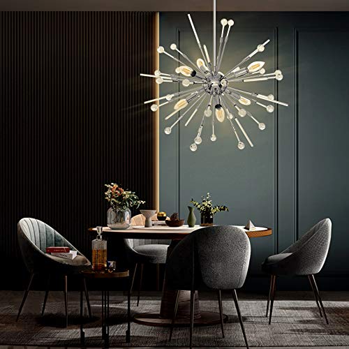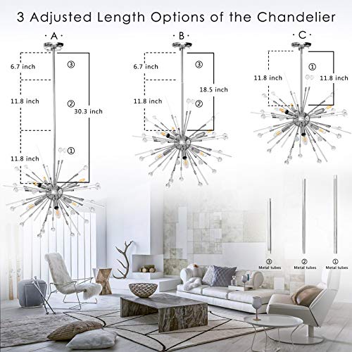 Details: Lucalda Modern Chandelier Lighting Fixtures Inspired with the modern minimalist design concept and romantice Firework style, Lucalda Modern Chandeliers design with stainless steel and acrylic bubble stick, just as a star to light up your house and your life, which compatible with a wide range of styles including modern, minimalist, luxury and art decor. Simple and Versatile, perfect for the different area of your house, such as dinning room, bedroom, kithcen, hallway, porch, etc. Specifications1-Product Dimensions: Dia 23.42 inches, the steel sling length: 32.08 inches minimum and 48.23 inches maximum 2-Voltage:110V 3-Bulbs Excluded:6 x E12 bulbs, totally 40W maximum. 4-Materials: Stainless Steel, Chromed Metal and Clear bubble acrylic. 5-Package Included: 1 x Chandelier 31x Round ball bar 13 x Straight bar installation hardware 1 x User Manual Customer Service Support If the chandelier is damaged when you receive the goods,Don't hesitate to contact us by message,we must reply you within 24 hours. We pursue reliable performance and our products continue to provide good value to our customers. Notice Please ensure the type of the bulb is E12 110V.Do not use 12V bulbs!Thanks!