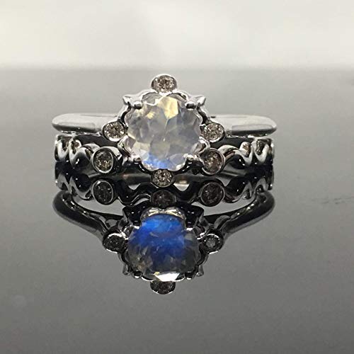 DESCRIPTION: This stunning, vintage, Victorian inspired engagement ring features a round, faceted Rainbow Moonstone. The Moonstone has the most beautiful play of color, which is impossible to capture in a picture. It is surrounded by an ornate design of four bezel set diamonds. This ring can also be make in 14K Yellow Gold or 14K Rose Gold. The top width of the ring is 9.4mm, with an approximate height of 7mm. The shank is at a dainty 1.7mm. The wedding band is 2.6 mm and sits flush, underneath the basket of the engagement ring.