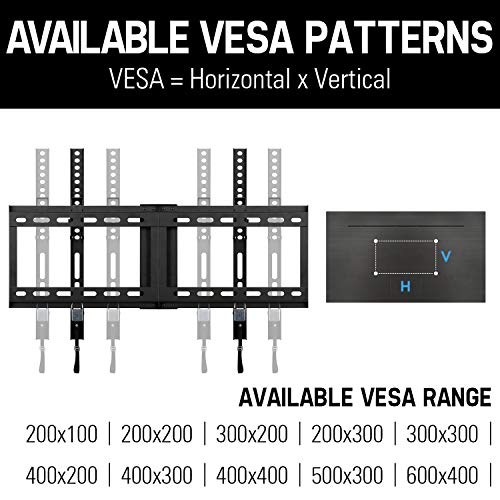 Details: TV wall mount fits most 37-70"" TVs up to 132 LBS with VESA (mounting holes spacing) from 200x100mm to 600x400mm The TV’s weight and mounting pattern are within the limit specified above Please DON’T depend on the screen size only Determine your TV's weight and mounting pattern first Please check possible blocked cable/input FITMENT: Compatible with most 37"" - 70"" flat panel TVs TV weight Up to 132 lbs VESA (mounting hole pattern) 200x100mm 200x200mm 300x200mm 200x300mm 300x300mm 400x200mm 400x300mm 400x400mm 500x300mm 600x400mm Applied on:Concrete Wall/Dry wall with wood studs (stud distance 16”-24"") Viewing angle Tilt adjusts 8 degree forward easy one-touch tilt to adjust angle easily with lock by strap so it will be stable once angle fixed Hanging notes To hang or take off TV make sure the tilting angle is 0-degree Please pre-tighten the inner side tilting bolts before hanging the TV on the wall plate