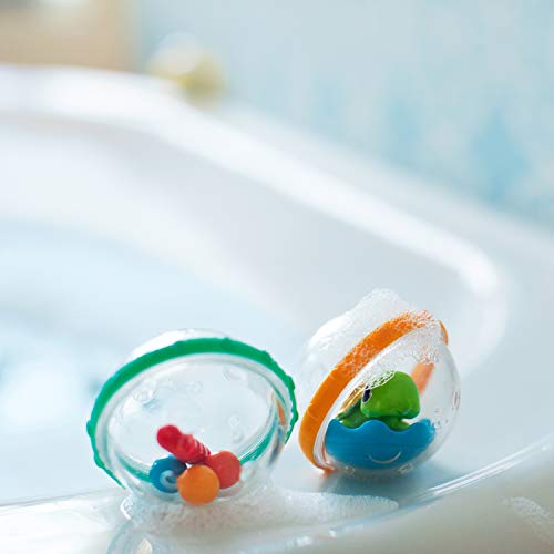 Details: Does your little one love things that rattle, bobble, spin and shine? Then fun is sure to pop with munchkin's float and play bath bubbles. Each floating bubble has a unique center toy that rattles, bobbles, shines and spins. They are sized for little hands to hold and help teach hand eye coordination as babies learn to reach, grasp and shake the bubbles. Colorful rings move freely around the bubbles giving lots of textures and movement for your little one to explore. With these float and play bubbles, bath time fun is about to bubble up.