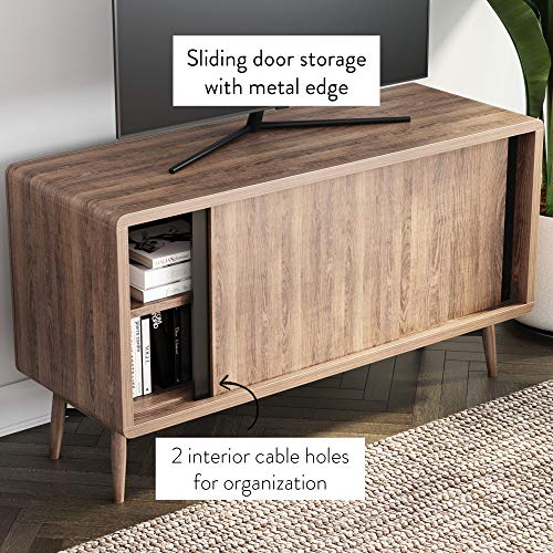 - Liam is a mid-century tv stand with a modern rounded-edge frame and sliding cabinet doors.