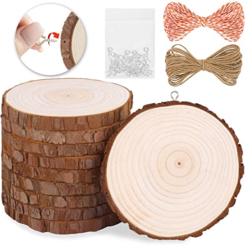 Details: Feature: Drilled on the Bark: Our unfinished natural wood slices are pre-drilled on the Bark instead of on the surface of the wood circles and with screw eye rings for decorating hanging, which could ensure the integrity of the wood slices compared to other products. Accessories: Each set of wood slices is equipped with complimentary jute twine and red-white twine, and a bag of screw eye rings. The number of screw eye rings in every bag is guaranteed to be more than 35 pieces. Don't worry about due to lack of screw eye rings to affect your collocation work. No Sawdust: We will not install the screw eye rings for the wood slices in advance. You could choose freely whether to install the screw eye rings or not by yourself according to your product creativity.And there is no sawdust falling down when you thread the twine string. Storage Advice: 1. Please avoid direct sunlight and rain. 2. Please store the product at a suitable temperature. 3. Brush tung oil on the surface will be helpful. Product Includes: Diameter: approx. 3.5"-4.0"/9-10cm Thickness: approx. 0.4" Quantity: Wood Slices X10pcs Screw Eye Rings: X35pcs Others Different Sizes are Available: 2.0-2.4 inches 30pcs 2.4-2.8 inches 30pcs 2.8-3.1 inches 20pcs 3.1-3.5 inches 20pcs 3.5-4.0 inches 20pcs