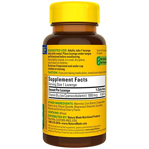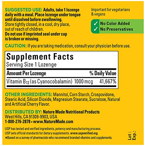 Details: Nature Made Vitamin B12 1000 mcg Sublingual Lozenges help convert the food you eat into cellular energy, and give your body the healthy cellular energy support it needs to get you through the day. Sourced from high-quality global ingredients, this B12 vitamin is a dietary supplement that has no color added and no added preservatives. Vitamin B12 is essential for proper red blood cell formation and normal function of the nervous system. This Vitamin B12 dietary supplement may be important for vegetarians or vegans who may avoid dietary sources rich in Vitamin B12. Adults take one Nature Made B12 1000 mcg cellular energy supplement daily with a meal. Place this Vitamin B12 supplement lozenge under the tongue until dissolved before swallowing. Nature Made's commitment to your good health lies at the core of every product made. Nature Made supplements are quality you can trust. USP has tested and verified ingredients, potency and manufacturing process. USP sets official standards for dietary supplements. Visit the USP verified website for more information. (1) Based on a survey of pharmacists who recommend branded vitamins and supplements.