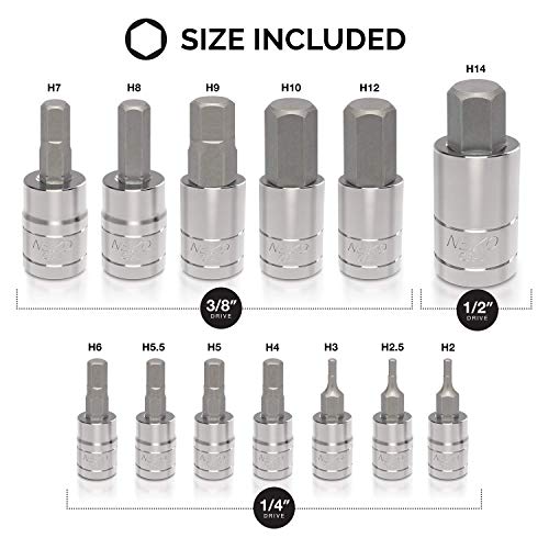 - [DRIVE SIZES]: This alley key socket set includes common 1/4-inch, 3/8-inch and ½-inch drive sizes.