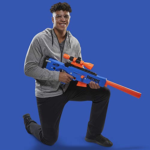 Details: The Nerf Fortnite BASR-R blaster is inspired by the one used in Fortnite, capturing the look of the one from the popular video game. The BASR-R blaster features bolt-action, clip-fed blasting and includes a removable 6-dart clip and 6 Official Nerf Elite darts. It comes with 3 free-standing bush targets so you can practice your aim or compete in dart-blasting games to test your skills against opponents. Use the removable scope to help with aiming. To start blasting, load 6 darts into the clip, pull the priming bolt back to ready the blaster, load the removable 6-dart clip into the blaster, push the bolt forward, and press the trigger to fire 1 dart. To fire another dart, move the bolt backward and forward, and press the trigger. Official Nerf foam darts are tested and approved for performance and quality. No batteries required. Eyewear recommended (not included).