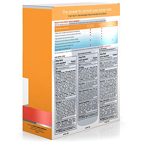 Details: Product Description The power to control your acne now. Clinically proven to start clearing breakouts in just 2 days. What's the proof that it works? Clinical studies prove that this system works to quickly reduce breakouts and delivers lasting results when used as directed. How does it work? This complete 3-step system takes the dermatologist's approach to treating acne by combining multiple medicines to treat acne's multiple causes in one high efficacy kit. Simply cleanse and treat twice-a-day. It is important to use all 3 products daily and consistently to help maintain clear skin. Step 1: skin polishing acne cleanser. Ingredients: salicylic acid 0.5% + microfine beads. Action: deep cleansing, gentle exfoliation of pore-clogging skin cells. Step 2: acne control lotion. Ingredient: prescription- grade benzoyl peroxide. Action: kills acne-causing bacteria to help reduce pimple size, redness and inflammation. Step 3: oil-free SPF 15 lotion (as needed). Ingredients: SPF 15 + proprietary botanical complex. Action: calms and protects irritated acne-prone skin from the sun, and promotes healthy looking skin. Amazon.com At a Glance: Clinically proven to start clearing breakouts in just two days Works faster than Proactiv Number-one dermatologist-recommended acne system The Power to Control Your Acne Now Clinically proven to start clearing breakouts in just two days. As the number-one dermatologist-recommended acne system, the Neutrogena Complete Acne Therapy System helps you control your acne. Using the proven acne medicines, this powerful acne system is clinically shown to start clearing breakouts in just two days, including blackheads, acne redness, and inflammation. Not only does the Complete Acne Therapy System work faster than Proactiv, it works fast and is gentle on your skin. How Does it Work? This complete three-step system takes the dermatologist's approach to treating acne and its multiple causes in one high-efficacy kit. Simply cleanse and treat twice a day. It is important to use all three products daily and consistently to help maintain clear skin. Click to . Clinically proven to day 2 day 4 day 7 Soothe pimple soreness Reduce blackheads Reduce redness & inflammation Improve skin texture Reduce full-face breakouts Step 1 Skin Polishing Acne Cleanser: This cleanser contains salicylic acid acne medicine and micro-fine beads designed to unclog pores as well as treat and help prevent pimples, blackheads, and whiteheads. Step 2 Acne Control Lotion: This lotion contains benzoyl peroxide acne medicine, which kills acne-causing bacteria, treats inflamed breakouts, and helps prevent future acne. Step 3 Oil-Free SPF 15 Lotion: This lotion contains a specialized botanical blend of SPF 15 and DermaNaturals, a botanical complex. It protects acne-prone skin from damaging UV rays, while calming and promoting the return of healthy-looking skin. What's in the Box A two-month supply of powerful products: Salicylic acid acne treatment cleanser, 5.1 fluid ounces SPF 15 lotion, 1.7 fluid ounces Benzoyl peroxide acne medicine lotion, 1.4 fluid ounces Explore the Neutrogena Acne-Fighting Line of Products: Body Clear Body Scrub A refreshing and clean-rinsing body scrub that treats and even helps prevent body breakouts. SkinClearing Liquid Makeup This oil-free makeup is the first and only liquid foundation formulated with MicroClear technology. It not only treats blemishes, but also helps prevent emerging breakouts. SkinClearing Mineral Powder The first and only gentle powder to blend soothing minerals with MicroClear technology that cuts quickly through oil to speed the delivery of powerful acne medicine straight to the source of breakouts. Rapid Clear Treatment Pads Clears breakouts fast and helps prevent emerging breakouts before they become visible. Rapid Clear 2-in-1 Fight & Fade Toner The first acne toner designed to reduc