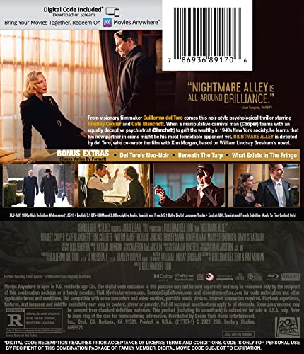 Details: From visionary filmmaker Guillermo del Toro comes this noir-style psychological thriller starring Bradley Cooper and Cate Blanchett. When a manipulative carnival man (Cooper) teams with an equally deceptive psychiatrist (Blanchett) to grift the wealthy in 1940s New York society, he learns that his new partner in crime might be his most formidable opponent yet. NIGHTMARE ALLEY is directed by del Toro, who co-wrote the film with Kim Morgan, based on William Lindsay Gresham's novel.