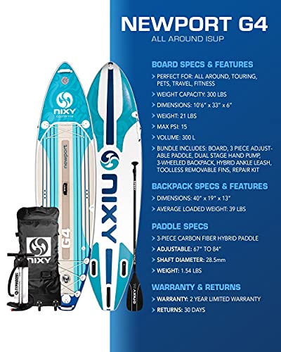 Details: NIXY Newport SUP Inflatable Stand Up Paddle Board: Construction: Dual Layer Advanced Woven Drop Stitch Fusion Laminated Technology Length: 10'6" (320 cm) Width: 33" (83.82 cm) Thickness: 6" (15.24 cm) Volume: 300 lt Board weight, fins included: 21 lbs. (9.79 kg) Complete package weight: 39 lbs. (16kg) Rider Weight: Up to 300 lbs. (136kg) - Experienced riders may exceed this weight Non-slip soft NIXY logo stamped, grooved, & UV protected traction pad 16x D-rings 5x M8 action mounts 3x grab handles – removeable neoprene on center handle Dual cargo adjustable/removeable bungee system Carbon fiber reinforced side rails Side bungee paddle holder 1x 9” tool-less removable US/FCS compatible center fin 2x 5” tool-less removable side fins NIXY Carbon Fiber Hybrid Paddle: 3-piece adjustable carbon fiber hybrid paddle Length: 67” to 84” (170 to 213 cm) Shaft Diameter: 28.5 mm Weight: 1.54 lbs. (25 oz) NIXY Typhoon Pump: Dual chamber high-pressure triple action hand pump Inflates up to 29 psi Low to high pressure switches Pressure gauge Dimensions: 25” x 13 ½ x 5” Weight: 4.34 lbs. (2kg) NIXY Hybrid Leash: Hybrid coiled/straight SUP leash designed for paddleboards Length: 10’ (305 cm) Diameter: 7 mm High quality polyurethane cord Stainless steel double swivels Deluxe ankle strap NIXY Backpack: Three wheel heavy duty backpack Length: 39” (99 cm) Width: 17” (43.18 cm) Thickness: 9” (20.53 cm) Weight: 5.75 lbs. (2.6 kg) Extra padded straps Cargo hooks Side pockets Pockets to tuck straps