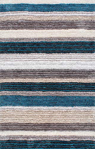 - A stunning array of colors mixed into this striped pattern gives a designer look and feel and makes a statement in any room. Colors include tan, brown, ivory, grey, and blue