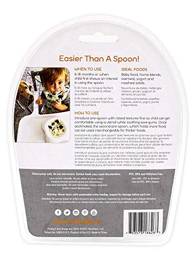 HOW TO USE: Introduce stage one pre spoon (with raised textures) first so child can soothe their sore gums as they are getting acclimated to holding the utensil. Once the child has learned the basic food-to-mouth motion, the stage two pre spoon, which holds more food, can be used interchangeably for thicker foods.