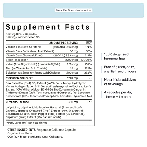 - THE SIMPLE ROUTINE FOR STRONGER HAIR: Just 4 pills per day of Nutrafol Men and 1 scoop of Collagen Infusion in 8oz of hot or cold liquid. Pro tip: Our quick-dissolving, flavorless collagen powder blends right in. Add Collagen Infusion to any liquid—including your morning coffee, tea, or smoothie.