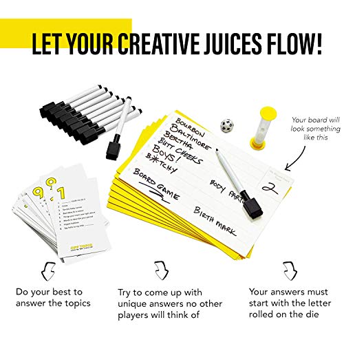 - HOW TO PLAY: Draw a card to set the topics, and roll the die to set the letter that your responses must begin with. Flip the sand timer and you're off! Race against time to write down answers for each topic that begin with the letter rolled.