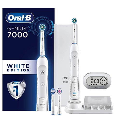 Details: The Oral-B SmartSeries White 7000 with Bluetooth is the world’s first of its kind with Bluetooth connectivity. Bluetooth communication allows the brush to connect with your smartphone to give you real-time feedback on your brushing habits. The professionally inspired design of the CrossAction brush head surrounds each tooth with bristles angled at 16 degrees, and 3D cleaning action oscillates, rotates, and pulsates to break up and remove up to 500% more plaque than a regular manual toothbrush. The pressure sensor lights up if you brush too hard to prevent harmful over-brushing and there are 6 modes and a timer to help you brush for a dentist-recommended 2 minutes. Best of all, it’s brought to you by Oral-B – the #1 brand used by dentists worldwide. Package includes 1 Oral-B SmartSeries handle, 1 CrossAction brush head, 1 3D White brush head, 1 Sensitive brush head, 1 premium charger with refill head storage, 1 premium travel case, smart guide. SmartSeries handles are compatible with the following replacement toothbrush heads: CrossAction, 3D White, Sensitive Clean, Precision Clean, FlossAction, Deep Sweep, Ortho and Dual Clean.