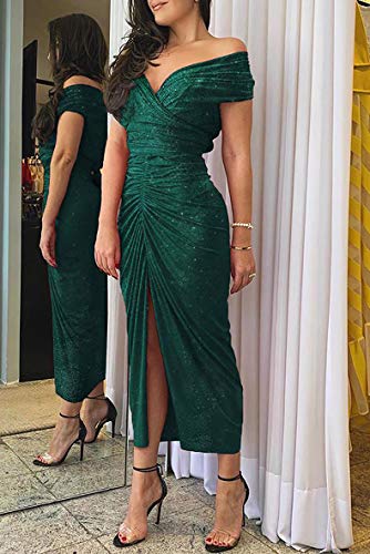 - Feature: Off shoulder, metallic glitter, short sleeve, high waist, front slit, ruched, midi lenght.