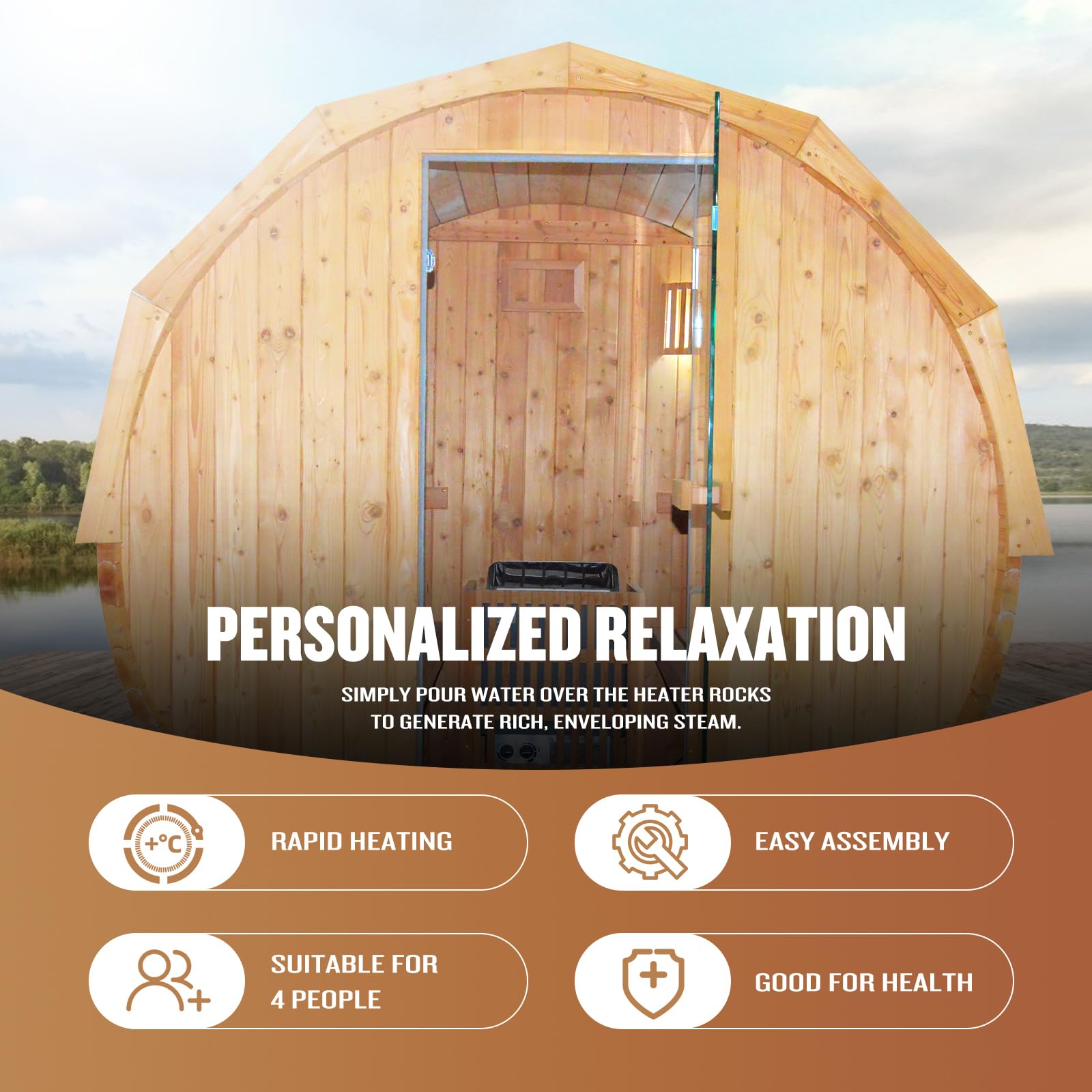 - Sauna includes all: Comes with 4.5KW heating furnace and our sauna room reaches the desired temperature in just 25-35 minutes. Our product is equipped with an LED explosion-proof lamp, a wooden cover, a stove frame, a wooden bucket, a wooden spoon, a thermometer and hygrometer, an hourglass, volcanic stones, two wooden teacup holders, two speakers, and so on.