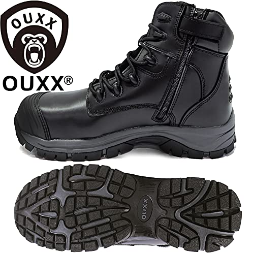 OUXX Work Boots for Men, Waterproof Steel Toe YKK Zipper Non-Slip Rubber Leather Shoes, Puncture-Proof, Breathable, Comfortable(Black, OX020, US 7.5)