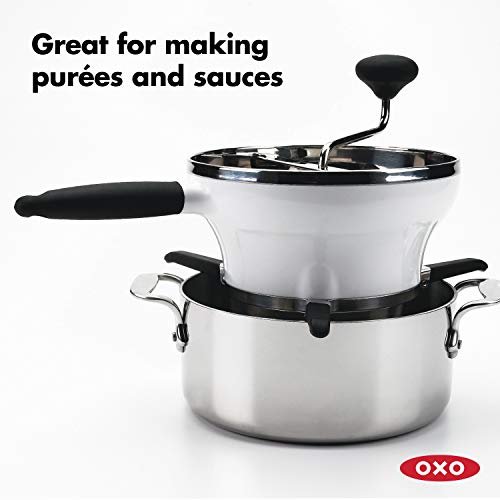 Details: The OXO Good Grips Food Mill is the perfect tool for preparing fresh purees, sauces, soups and more. It has a stainless steel inner bowl that is ideal for hot foods and will not stain, and includes 3 stainless steel grinding discs for fine, medium and coarse textures. Use the fine disc for homemade jellies, creamy sauces and baby food, the medium disc for applesauce and vegetable soups, and the coarse disc for mashed potatoes and chunkier sauces. The Food Mill has a unique release button that makes it easy to exchange discs and disassemble for storage. Three non-slip legs hold the Food Mill securely over bowls and pots up to 11 inches in diameter, keeping it out of your food. The legs also fold for easy storage. The soft, non-slip handle and knob ensure comfort when gripping the Food Mill and turning the blade. All parts are dishwasher-safe.
