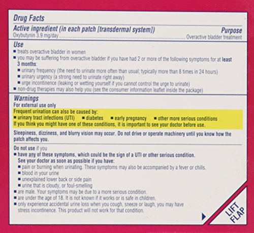 Details: Treats overactive bladder in women. You may be suffering from overactive bladder if you have had 2 or more of the following symptoms for at least 3 months: urinary frequency (the need to urinate more often than usual; typically more than 8 times in 24 hours); urinary urgency (a strong need to urinate right away); urge incontinence (leaking or wetting yourself if you cannot control the urge to urinate). Non-drug therapies may also help you (see consumer information leaflet inside the package). Full prescription strength. 1 patch treats 4 days/4 nights. 32-day supply.Active Ingredients: Each Patch (Transdermal System): Oxybutynin 3.9 mg/Day
