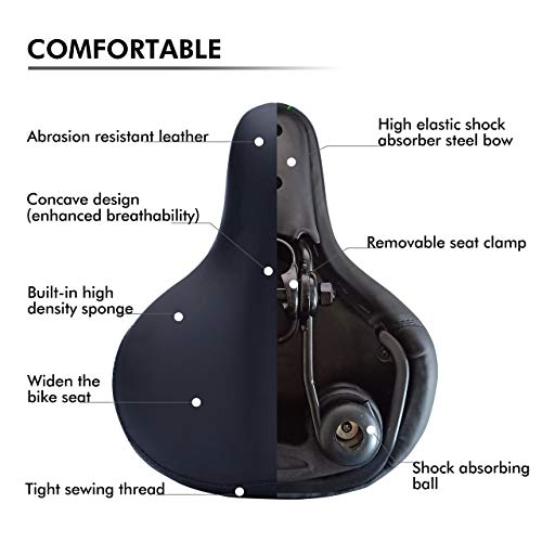 - Waterproof and Wear-resistant:High quality leather, abrasion resistant, scratch resistant. The material is 100% weatherproof you rode your bike after leaving it outside in the rain. Your butt stayed dry after you've wiped the water off your saddle.