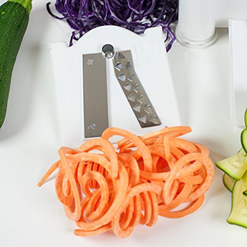 - Includes: 1 x Vegetable spiralizer / slicer plus 3 blades for vegetable strands & zucchini noodles