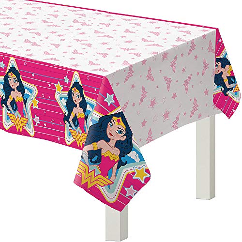 - Set the foundation for your party with a paper table cover featuring Wonder Woman and her Lasso of Truth on a bright pink border, plus her "WW" emblems in the center; measures 54 inches by 96 inches