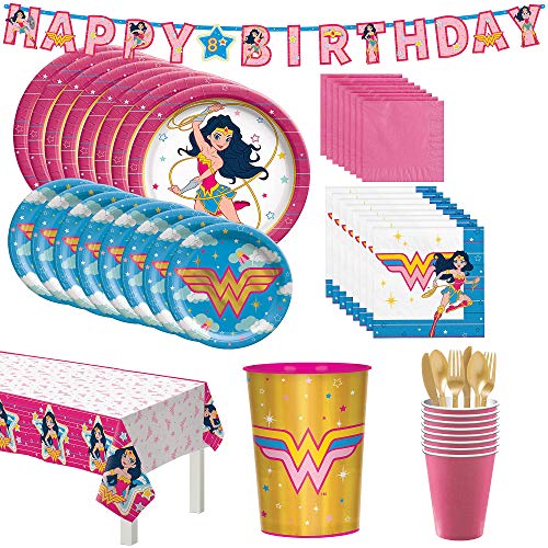 Details: Throw an epic birthday party for your little superhero fan with Superstar Wonder Woman Birthday Tableware for 16 Guests. In blue, bright pink, and metallic gold, this pack has everything you need for an adventure-filled tablescape. First, set the foundation for your party with a paper table cover featuring Wonder Woman on a bright pink border and her "WW" emblems in the center, which makes post-party cleanup a breeze. Serve a meal and sweet treats on 2 sizes of round lunch and metallic small dessert paper plates, and keep guests' hands (and your table) clean with matching lunch and solid bright pink small beverage napkins. Treat your guests to warm or cold party drinks in solid bright pink paper party cups, and complete place settings with gold premium plastic forks. Create the perfect party backdrop with a letter banner strung along string that reads "Happy Birthday." The letters feature Wonder Woman and her Lasso of Truth plus add-on numbers and characters to personalize the age. The durable plastic metallic favor cup featuring the "WW" logo is perfect as a game prize or souvenir for the birthday kid.