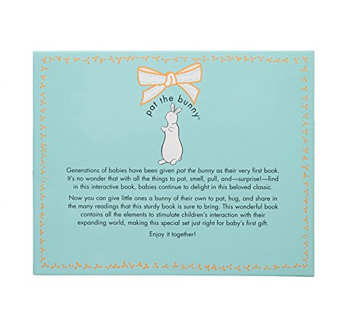 Details: Product Description Give an extra-special gift this Easter with this Pat the Bunny book and plush toy set! This beloved children’s book uses a plastic comb binding that provides easy page turning perfect for small hands to play with again and again. For over 75 years, Pat the Bunny has been creating special first-time moments between parents and their children. One of the best-selling children’s books of all time, this classic touch-and-feel book offers babies a playful and engaging experience, all the while creating cherished memories that will last a lifetime. This lovely gift set comes with an adorable plush bunny, perfect for gift giving. Amazon.com Review "Here are Paul and Judy. They can do lots of things. You can do lots of things, too." Pat the Bunny is the original interactive, multimedia experience for kids. Virtually unchanged since its introduction in 1940, the kind tone and sweet illustrations in this classic recall a bygone era, while the simple language and large print invite kids to get interested in the written word as an invitation to thought and action. Each page shows Paul or Judy involved in an activity--playing peekaboo, smelling flowers, and, of course, patting the bunny--and then guides the reader to do the same. On the pages are a scrap of cloth with Paul hiding underneath (peekaboo), fuzzy fabric (the bunny), scented paper (the flowers), and five other now-famous features that invite a child to play with the book. As one of the bestselling children's books of all time, Pat the Bunny has become a tradition passed from one generation to the next to instill a love of books and reading. This gift set includes the book and a soft, baby-safe velour bunny toy that is loyal to the quirky bunny illustration in the book. Baby will love to take bunny along when the book has to go back on the shelf. (From birth) --Katherine Ferguson From the Inside Flap This book and plush set is a wonderful gift for parent and child that extends the interactive experience with a soft cuddly plush. About the Author DOROTHY KUNHARDT (1901-1979) was the author of the beloved classic Pat the Bunny, one of the best-selling children's books of all time.