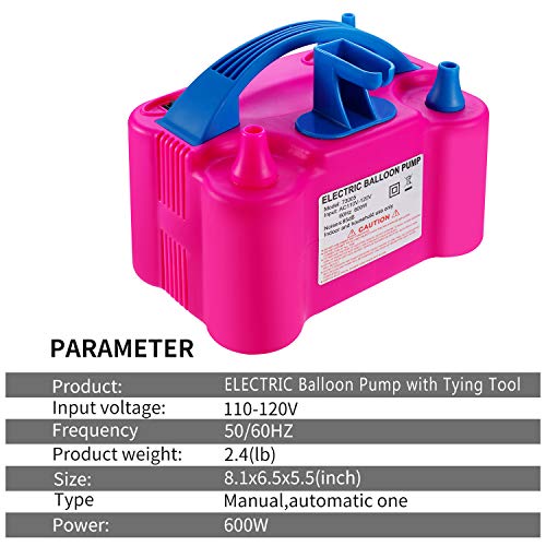 Details: Electric Air Balloon Pump and Balloon Tying Tool In One,110V 600W Portable Dual Nozzles Electric Balloon Inflator with Tying Tools, 20 Flower Clips, Tape Strip, Dot Glues and Balloon Tube for Party Decoration Faster and Save Time Balloon Inflator 110V 600W for Party Decoration Birthday Show Features: Inflate simple balloons in 2 second portable design easy to use Two operation modes: manually and automatically Two extended nozzles to fit different sized balloons Electric air balloon pump with balloon tie tool,after the inflation is completed, it can be knotted directly on the balloon knot tool.Release your hands and prevent sore of fingers - Save your time and make the assemble faster and simpler.Easy to use,quick and easy tying. Specification: Input voltage: 110V-120V Frequency: 50 / 60Hz Power: 600W Weight: 2.65LB Cable Length: 70.8 inch Operation Mode: manual or automatic Packing size: 8.1 * 5.5 * 6.5 inch Package Includes: 1 x Electric Air Balloon Pump and Balloon Tying Tool In One 1 x User manual 1 x Tying Tool 1 x Balloon Tube 2 x 5 meters Tape Strips 2 x 10 meters Dot Glues(100dots) 20 x Flower Clips Notes: Do not use this air pump to inflate helium or hydrogen balloons. The best suitable for advertising balloons promotional activities and balloon decoration and festive scene layout, the inflation rate is fast, simple and flexible operation, switch control inflation, classified as continuous and touch-on two patterns, the appearance of lightweight, portable design.