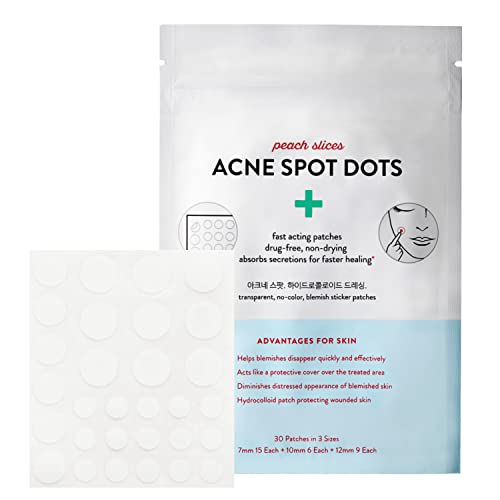 Details: Peach Slices Acne Spot Dots:The Peach Slices Acne Spot Dots are small, translucent and fast-acting acne patches that actively absorb a developing blemish or an already-present pimple. The sticker-like hydrocolloid acts as a protective cover over the treated area to keep you from picking and quickly and effectively helps reduce inflammation so the blemish becomes visibly smaller in less than one day. The Peach Slices Acne Spot Dots are non-drying (so no flaking!) and come in a variety of sizes that can be worn night or day with or without makeup.