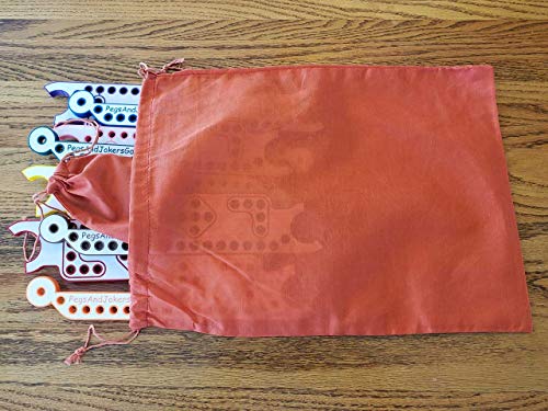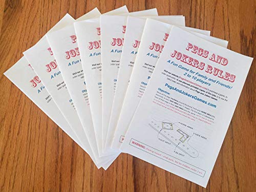 Details: THIS FULL SIZE Pegs and Jokers game set is for those who like playing with bigger board sets. The boards are 11-1/2" long, the Pegs are 1-1/4" tall.This set can be played by as few as 2 players or by as many as 8 players. GAME SET DETAILS - Our unique Pegs are styled in the shape of a Horse's head, easy to grasp and don't roll around when dropped like marbles do. - Comes with an EXTRA MAN of each color (6 men of each color, you play with just 5 of each color) so if you lose one, you game set isn't ruined. - Each game set includes 2 cloth drawstring bags to carry everything (a small bag for the men and a large bag for everything), or you can use the white shipping box to store the game. (Color and style of the drawstring bags may vary from that shown in the photos) - Includes 8 copies of the rules, one for each player. - Includes 4 decks of playing cards with 52 cards and 2 Jokers in each deck. Brand of cards may vary from what is shown in the listing images. - The 8 Player game can be split into 2 games. Instead of playing 1 game with 8 players, you can split the set into 2 games of 4 players. Just sort the cards by their blue and red colors to make two separate decks to play with. - MADE IN AMERICA in Arizona by an American College student using the profits to pay for his college education. HOW TO PLAY THE GAME The object of the game is for each player or team to move all five of their pegs clockwise around the board, from the player's HOME AREA (the "diamond" shape) to his or her SAFE AREA (the “L” shape). The first team or individual to have all their pegs in their SAFE AREA wins the game. Players take turns drawing cards from a draw pile, the card drawn determines the number of spaces that player's chosen peg is to be moved either forward or backwards depending on the card.Order Yours Today!