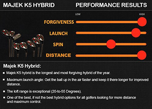 Details: Perfect for Petite Lady Golfers over the age of 55 Years having problems with their current iron set. Replace Your Entire difficult to use iron set with the Majek K5 all hybrid iron set! Majekally improve your Hybrid-Iron game! Pure Golf Engineering: Majek Hybrid was Co-Engineered by members of the UCLA engineering department. This unique relationship and pure engineering approach created the Majek All Hybrid Iron Set. Benefits of the Majek Hybrid: -More Weight Positioned Behind The Sweet Spot -Deeper Cavity Back Creates A Tighter Shot Dispersion, Which Increases The Accuracy On Off Center Hits. -Aerodynamic Design Creates A Reduction In Drag, Which Leads To Higher Club Head Speeds -Wide To Thin Crown Design Creates A Lower CG To Promote Higher Launch Angle For More Distance -Lightweight Premium Graphite Shaft Promotes Faster Swing Speed For Greater Distance. -Black Crown And Arrow Markers Make Alignment Easy And Eliminates Glare. Support A Local Company: Your Custom Made Majek Golf Hybrid Is Assembled By Hand In Riverside, CA, USA And Delivered Direct To Your Door.