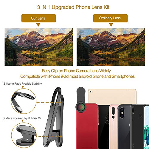 - 【Premium Quality】 : Unlike cheaper phone lens, the phone Lens kit is designed with industrial grade aluminum along with premium optic lenses, so you can capture shots with amazing clarity and detail while being confident knowing they’ll last. No more vignetting, no more blurring, no more breaking .