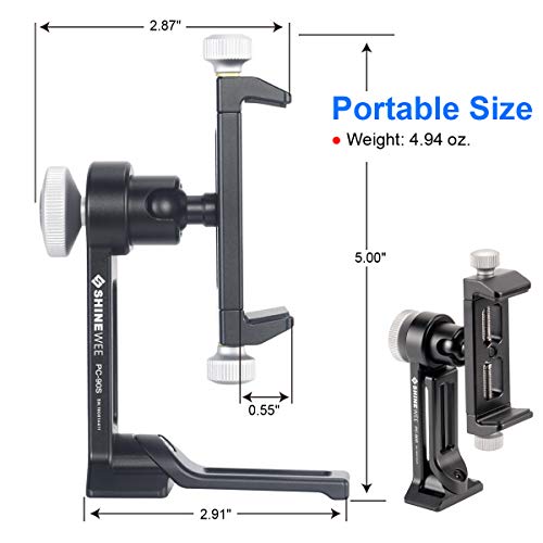 Details: Designed for the mobile phone photographer, this is our elegant solution for securely mounting almost any phone. Our feature-packed clamp adjusts to accommodate most phone widths from as small as 2.36 in (60mm) up to 3.5 in (90mm). Simply use the knob to lock the phone in place. The inward-angled jaws keep your phone in place and are lined with firm rubber, which not only protects the phone, but also prevents it from slipping out. There are one 1/4"-20 mounting sockets on the botton of Pocket Stand conveniently positioned the Phone Clamp on other common mounts. You can also use quick-release dovetail mounting your phone on a tripod. Open the Flexible L-shape stand can use your phone on a table directly. Package Includes: 1* Phone clamp; 1* drawstring bag; Material: Aircraft Grade Aluminum Alloy. Net Weight: 4.94 oz.