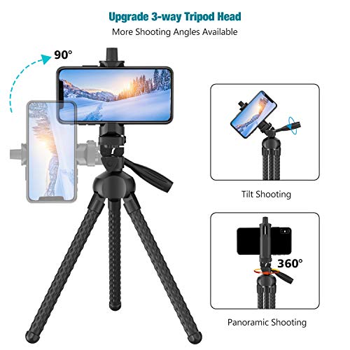 - More Shooting Angles with Upgraded Tripod Head - Our flexible phone tripod is equipped with a 3-way head and convenient handle, allowing for tilt and swivel motion, portrait or landscape options. Letting you can be easily to position the phone or camera to the subject in various angles for superior perspectives. 360 degree rotating head, allows you to shoot panoramic photos or videos, perfect for video recording, live streaming, biking, taking selfies or more.