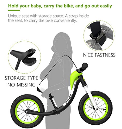 - ASY CARRYING: Unique patented design seat with storage space with CARRYING STRAP which is used for parents to carry the bike easily. The strap is easy to use and simple to install. Use it before or after your little one rides.