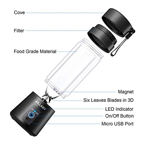 Details: Specification:: Product Size: 9.5X3.2X3.3 inch. Bottle Capacity: 13OZ. Battery Type/ Capacity: 2000mAh 3.7V. Motor Speed: 22000 rpm/min. Charging Time: About 3 Hours. Full charged using time: 12-15 Times. Temperature: Below 50℃/120℉ . Blender Material: BPA free and food grade materials. Package Include: 1*Aillary portable Juicer Blender. 1*USB Cable. 1*User Manual. 1*Cleaning Brush for Blender. HOW TO USE YOU AILLARY PORTABLE BLENDER: 1.Prepare the fruit you like, Cut frit into the size around 1 inch. . 2.According to your personal taste, add water or milk . put the fruit in and make them lower than 80% of the bottle.. 3.Tilt down the Travle Blender to 45 degree and then start the Blender with shake 5-8times will For maximum power 4.Enjoy the fresh and healthy drink. NOTES: 1.The portable smoothiel blender pedestal could not be soaked into water while washing it. 2.Before first use, it requires to charge about 3-5 hours.This blender lights turns red while charging and blue once full charged. 3.Align arrow marking to the switch on base. Otherwise The usb blender is under safety protection status and unable to turn on. 4.This portable Blender is not suitable for hot drink more than 50 degree which will be easy cause damage or leakage.