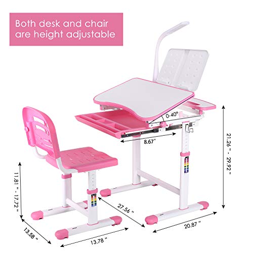 Details: Description: Kids desk and chair set is made of high-quality iron and MDF materials. Both table and chair are height adjustable. The mesh back and cushion of the chair adds air circulation, which is safe and comfortable. Various practical functions, tilt 0-40° non-reflective full-wood desktop; pull out 22cm drawers, embedded recesses can storage of stationery, books; steel hook hanging school bags, cups and so on. The three-speed adjustable brightness table lamp can make children happy to learn and paint at night, without hurting the eyes. It is the best choice for your child's growth. Specifications: Material: iron + plastic + MDF material Table Size: 27.56x20.87x21.26’’ (L*W* H) Table Height Adjustable: 21.26" - 30" Chair Size: 13.58x13.78x11.81"(L*W* H) Chair Height Adjustable: 11.81"-18.11" Desktop Tilt Range: 0-40° Drawer Pull-out Length: 8.67” Lamp Wattage: 1.3W, 3.1w, 6w Lamp Lifespan:> 35000H Input: 100-240v Output: 5v Color: Pink Package Include: 1* Desk Chair Set(with Accessories) 1* Led Lamp 1* User Manual Note: 1. Using kid table and chair set should be placed on a flat surface. 2. Please check screws regularly to ensure there are no loose parts during daily use. 3. Due to the problem of the light, the product has a certain color difference. 4. Due to the problem of the manual measurement, the product has a certain size difference.
