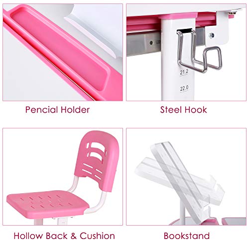 - HEIGHT ADJUSTABLE: Children's desk and chair set are both height adjustable, desk height from 21.26"- 30" and chair from 11.81"-18.11", suitable for children aged 3-15 years old, adjustable height seat back and cushion hollow design, breathable, accelerating air circulation helps to adjust the child's sitting posture, increase comfort, and perfect accompany them grow up.