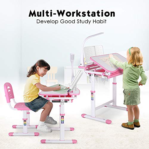 - MULTIPLE FUNCTIONS: On the table has a drawer that can pull out 22cm length to store paper, books, stationery, etc; the embedded recess can fix the pen and pencil, and the side has a multi-function steel hook to hang the bag, cup and so on that can reduce clutter and have bigger learning space. Three-speed adjustable brightness desk lamp make your kids study more relax at night, not hurt eyes.