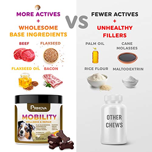 - KEEP A BOUNCE IN HIS STEP: We know your dog’s physical health and vitality is as important as your own. If you love your dogs like we do, show them you care by choosing Primova Hip and Joint Chews for Dogs with Glucosamine Chondroitin. Everything you need to keep his ball-chasing skills intact in 1 tasty bite.