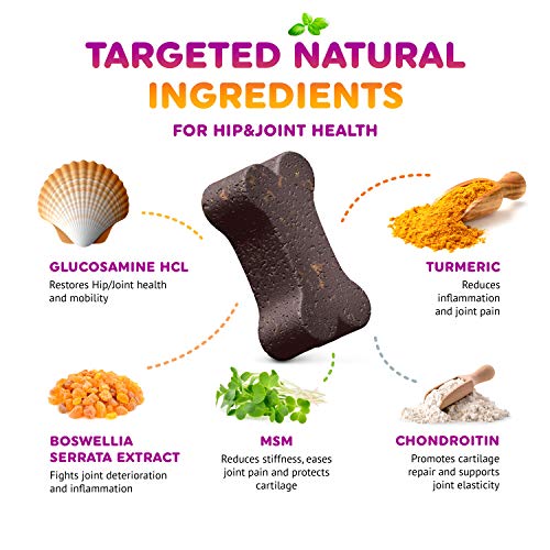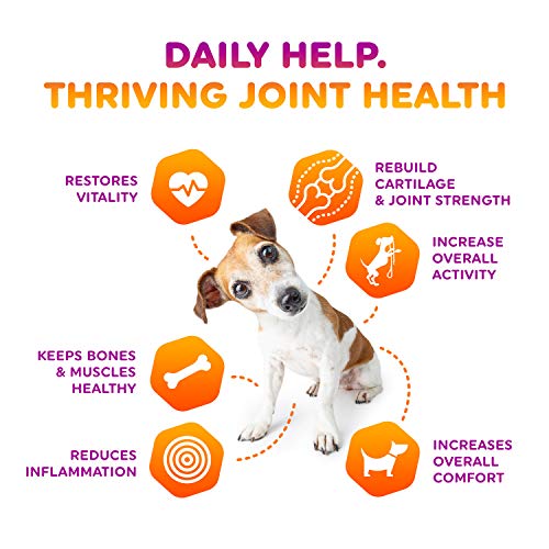 - SUPERIOR FORMULATION: Formulated in a USA GMP registered facility, we utilize far more active dog-loving ingredients than our competitors offer. Our natural and grain free vet approved joint supplement for dogs improves dog’s mobility, eases joint pain, relieves symptoms of arthritis such as limping, softens aging discomfort and improves vitality