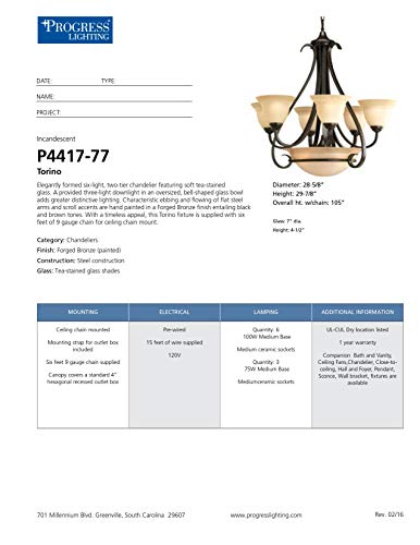 Details: Product Description Elegantly formed six-light, two-tier chandelier featuring soft tea-stained glass. A provided three-light downlight in an oversized, bell-shaped glass bowl adds greater distinctive lighting. Characteristic ebbing and flowing of flat steel arms and scroll accents are hand painted in a Forged Bronze finish entailing black and brown tones. With a timeless appeal, this Torino fixture is supplied with six feet of 9 gauge chain for ceiling chain mount. From the Manufacturer Casual and rustic with a certain modern flair, the Torino Collection features a scrolled frame in a rich bronze finish that captures lightly ambered glass shades with a unique textured pattern. 6-Light, 2-Tier chandelier with 3-Light downlight in tea stained oversized, bell-shaped glass bowl. Distinctive ebbing and flowing of squared scrolls and arms in Forged Bronze finish. Uses (6) 100-Watt medium base bulbs 28-5;8-Inch Diameter by 29-7;8-Inch Height.