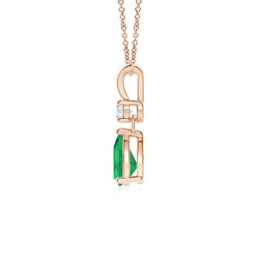 Details: A vivid green pear cut emerald dangles from a sparkling white diamond on this elegant drop pendant. The lustrous V bale adds beauty to this 14k rose gold emerald and diamond pendant. It exudes luxurious charm with its remarkable long drop design.