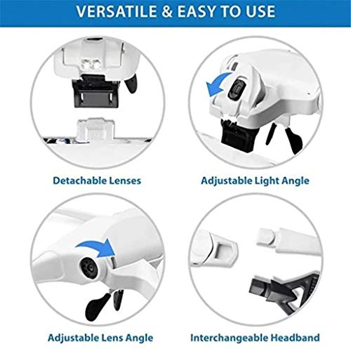 Details: Specification: Great for collections, circuits, jewellery, etc Material: ABS(Acrylonitrile Butadiene Styrene) + Acrylic Color: White Size: Approx. 14.5 x 22 x 8cm Power Supply: 3 x AAA Batteries(not included) Multiplying power of lens: 1.0X, 1.5X, 2.0X, 2.5X, 3.5X Package includes: 1 x Magnifier 1 x Headband 5 x Lens(1.0X, 1.5X, 2.0X, 2.5X, 3.5X) 1 x Instruction 1 x cleaning cloth