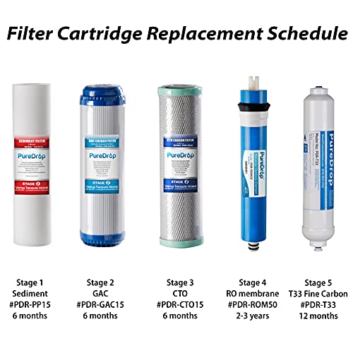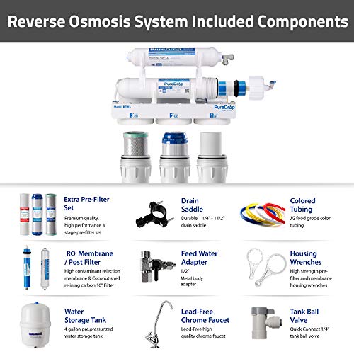 Details: Still spending money on bottled water? PureDrop Reverse Osmosis water filtration system provides a simple and compact solution to meet your daily drinking water needs. The system uses a 5-stage filtration process which includes a polypropylene sediment filter, granular activated carbon filter, carbon block filter, 0.0001 micron reverse osmosis membrane and a post carbon filter, to provide great tasting bottled-quality water. The package includes: Signature 5-piece filter set; 3 Gal. storage tank with 2.2 Gal. capacity, serves daily water usage of a family of 4; Food grade tubing set including all required parts and valves; Lead-free, crafted chrome faucet; Housing wrench; User manual.