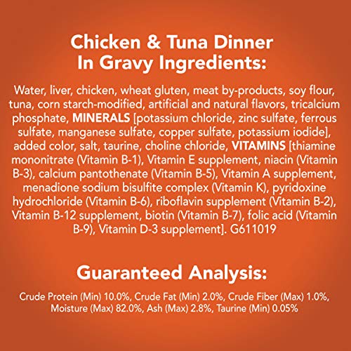 Details: Make your cat's mouth water with anticipation every time you serve Purina Friskies Prime Filets Chicken & Tuna Dinner in Gravy wet cat food. Real chicken and tuna deliver the purr-fect meaty flavor combination your cat adores as an innate meat eater, and the delicate, shredded chunks give her a delectable texture she can't wait to sink her teeth into and gobbles off the plate. Watch as the rich aroma piques her curiosity every time you open a can and pour it into her bowl, and let her delight in the savory juices that add extra flavor and moisture to each bite. With 100% complete and balanced nutrition for adult cats in every serving, this Purina Friskies Prime Filets recipe makes it easy to offer her high-quality meals that also meet her nutritional needs each day. Fill her dish with this canned wet cat food at mealtime, and show your cat that you pay attention to her cravings and take her needs into consideration.