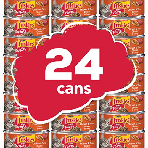 - Twenty-Four (24) 5.5 oz. Cans - Purina Friskies Gravy Wet Cat Food, Prime Filets Chicken & Tuna Dinner in Gravy