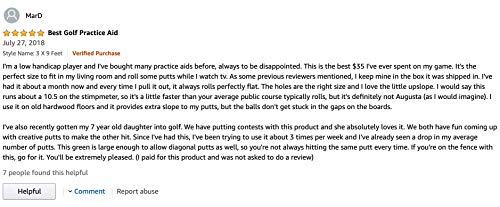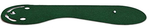 Details: Product Description A great practice aid for your putting stroke. 9' x 3' Kidney shaped green gives you 3 cups to aim at. High quality putting surface designed to stay smooth. Amazon.com Hone your putting skills with this fun 3-by-9-foot putting green. The kidney-shaped green's three cups give you plenty of practice targets, while the built-in sand traps are designed to catch missed shots. The green also offers a high-quality putting surface designed to stay smooth over time.